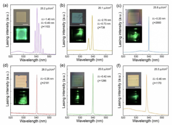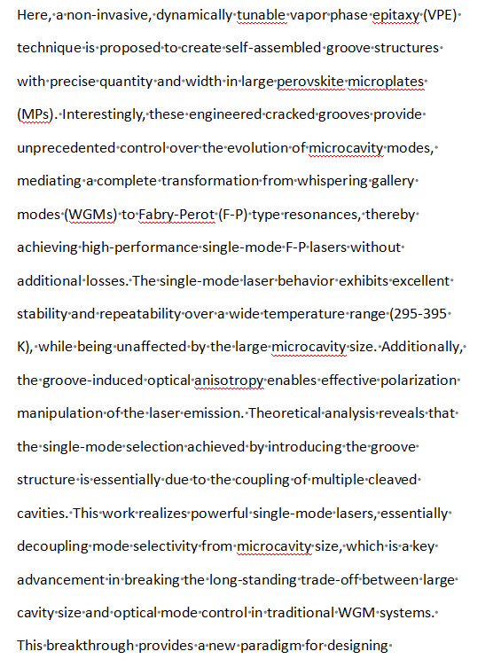Surprisingly, the strategically embedded groove structures in perovskite microplates can fundamentally manipulate their associated laser characteristics. As shown in the figure, with the increase in the number of grooves, the emission spectrum evolves