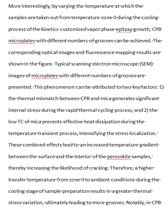 CsPbBr3 (CPB) microplates were fabricated on ultrathin mica substrates by a simple vapor phase epitaxy method in a two-zone tube furnace. Notably, the formation of groove structures within the CPB microplates was achieved by artificially controlling the cooling rate during the vapor phase epitaxy growth process. The detailed synthesis protocol is provided in the experimental section. Initially, the formation mechanism of these grooves within the microplates was systematically investigated, as shown in the figure. As previous studies have indicated, morphological defects (e.g., growth-induced
