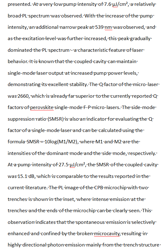 the coupled cavities are highly sensitive to the gap between the two cavities, where the scattering and diffraction effects influenced by the gap spacing play a crucial role in determining the coupling strength. It was found that grooves with widths approximately between 80 and 90 nanometers could achieve effective inter-cavity coupling. Therefore, the observed single-mode laser is attributed to the coupling effect produced by multiple cleaved cavities. FDTD simulation results indicate that the microcavities in the groove regions exhibit a relatively large free spectral range (FSR). Due to this characteristic, single-mode laser emission was observed in these microchips with engineered groove defects. The amplified electric field distributions at the microchip end faces and grooves are shown in the figure. Additionally, compared to the intact structure, the number of laser modes in the grooved microchip was significantly reduced, although single-mode operation was not achieved. This is because the width of the air gap in the coupled cavities plays a key role in determining the laser behavior. The electric field distribution of a perovskite microchip with an embedded groove (width approximately 165 nanometers) is shown in the figure. This larger air gap enhances the outward light scattering while reducing the optical transmission between the terminal microcavities, ultimately lowering their coupling efficiency. based on the above discussion, three fundamental conditions are required to achieve high-performance single-mode lasers in perovskite microchips: i) an optimal number of grooves; ii) a sufficiently narrow air gap to ensure coupling efficiency; iii) an appropriate distribution of groove positions.