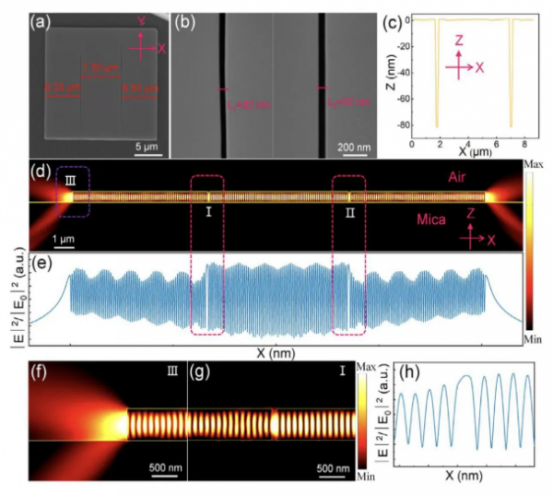 Further research was conducted on the influence of groove structures on the performance of CPB microchip lasers. As shown in the figure, the two-groove microchip exhibits nearly symmetrical groove positions and a uniform width distribution. The groove depth and microchip thickness were determined using atomic force microscopy (AFM) characterization. These cracked microcavities may affect the formation and selection of laser modes. The figure reveals significant electric field changes at the groove positions of the microchip due to the interaction of coupled cavities. Notably,