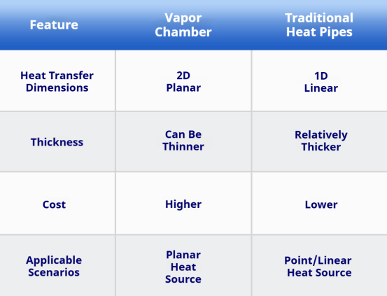 The thermal conductivity of a traditional heat pipe is approximately 5000–10000 W/m·K, while that of a VC ranges from 10000–20000 W/m·K—twice or even higher than the heat dissipation efficiency of a heat pipe. A heat pipe can be regarded as conducting heat via 1D point-to-point transfer, whereas a VC achieves 2D surface-to-surface heat dissipation, resulting in a larger heat dissipation area and higher heat removal capacity per unit time. Most importantly, it can accommodate the heat dissipation of multiple heat sources at different heights.