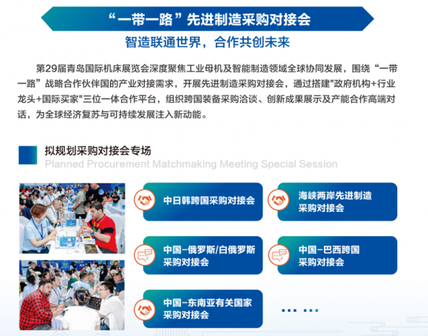 第29屆青島國(guó)際機(jī)床展覽會(huì)深度聚焦工業(yè)母機(jī)及智能制造領(lǐng)域全球協(xié)同發(fā)展,圍繞“一帶一路”戰(zhàn)略合作伙伴國(guó)的產(chǎn)業(yè)對(duì)接需求,開展先進(jìn)制造采購(gòu)對(duì)接會(huì),通過搭建"政府機(jī)構(gòu)+行業(yè)龍頭+國(guó)際買家"三位一體合作平臺(tái),組織跨國(guó)裝備采購(gòu)洽談、創(chuàng)新成果展示及產(chǎn)能合作高端對(duì)話,為全球經(jīng)濟(jì)復(fù)蘇與可持續(xù)發(fā)展注入新動(dòng)能。