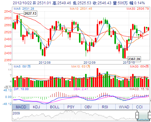 今 開: 2531.01 最 高: 2549.46 最 低: 2525.53 振 幅: 0.94% 昨 收: 2542.79 成交量: 5056955手 成交額: 514906.73萬(wàn) 換手率: --