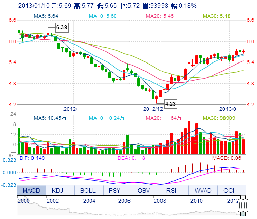 今 開: 5.69 成交量: 9.40萬手 振 幅: 2.10% 最 高: 5.77 成交額: 5370.39萬元 換手率: 1.05% 最 低: 5.65 總市值: 50.97億 市凈率: 1.95 昨 收: 5.71 流通市...