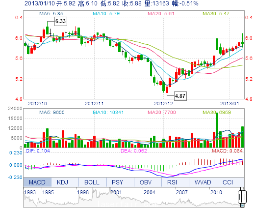 今 開: 5.92 成交量: 1.32萬手 振 幅: 4.74% 最 高: 6.10 成交額: 785.35萬元 換手率: 0.76% 最 低: 5.82 總市值: 10.21億 市凈率: 2.62 昨 收: 5.91 流通市...