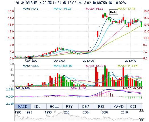 | 今 開: | 14.20 | 成交量: | 6.98萬手 | 振 幅: | 9.12% |