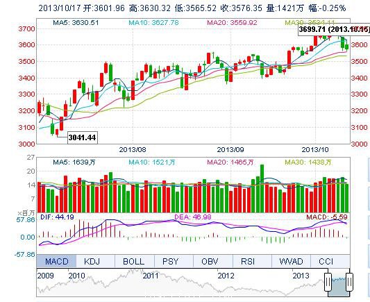今開: 3601.96 最高: 3630.33 昨收: 3585.16 最低: 3565.52 成交量: 1421.36萬手 振幅: 1.81% 成交額: 173.22億元