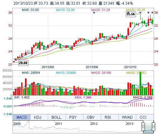 今開(kāi): 33.73 成交量: 2.13萬(wàn)手 振幅: 7.45% 最高: 34.55 成交額: 7066.41萬(wàn)元 換手率: 0.63% 最低: 32.01 總市值: 141.04億 市凈率: 9.17 昨收: 34.08 流通市...