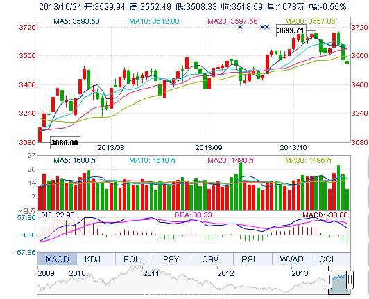 今開: 3529.94 最高: 3552.49 昨收: 3538.16 最低: 3508.33 成交量: 1078.08萬手 振幅: 1.25% 成交額: 129.36億元