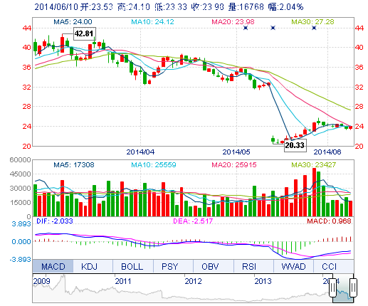 今開: 23.53 成交量: 1.68萬手 振幅: 3.28% 最高: 24.10 成交額: 3992.93萬元 換手率: 0.32% 最低: 23.33 總市值: 156.35億 市凈率: 5.96 昨收: 23.50 流通市...