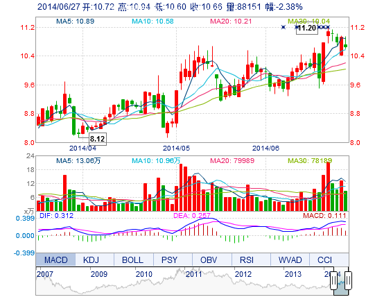 | 今 開: | 10.72 | 成交量: | 8.82萬手 | 振 幅: | 3.11% |