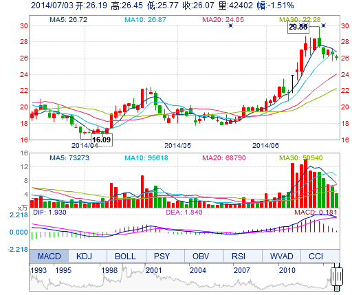 | 今 開: | 26.19 | 成交量: | 4.24萬手 | 振 幅: | 2.57% |