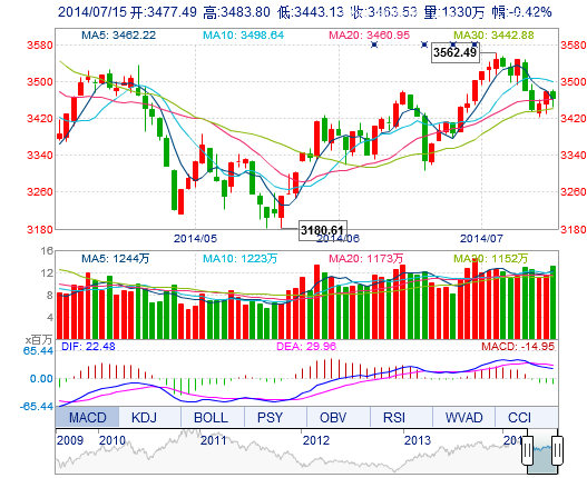 今開(kāi): 3477.49 最高: 3483.80 昨收: 3478.01 最低: 3443.13 成交量: 1329.88萬(wàn)手 振幅: 1.17% 成交額: 208.49億元