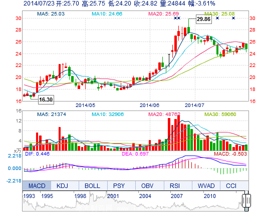 今開: 25.70 成交量: 2.48萬手 振幅: 6.02% 最高: 25.75 成交額: 6162.51萬元 換手率: 1.43% 最低: 24.20 總市值: 43.11億 市凈率: 12.46 昨收: 25.75 流通市...