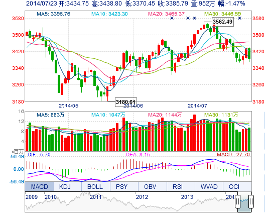 今開: 3434.75 最高: 3438.80 昨收: 3436.19 最低: 3370.45 成交量: 951.87萬(wàn)手 振幅: 1.99% 成交額: 158.41億元