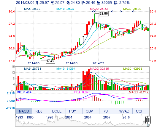 | 最 低: | 24.80 | 總市值: | 44.22億 | 市凈率: | 12.79 |