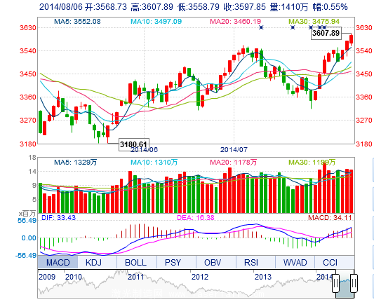 今開(kāi): 3568.73 最高: 3607.89 昨收: 3578.27 最低: 3558.79 成交量: 1410.09萬(wàn)手 振幅: 1.37% 成交額: 207.21億元