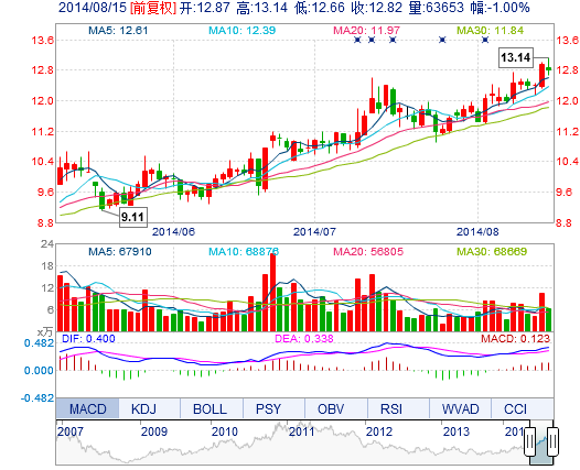 今開: 12.87 成交量: 6.37萬手 振幅: 3.71% 最高: 13.14 成交額: 8185.95萬元 換手率: 3.19% 最低: 12.66 總市值: 25.54億 市凈率: 5.15 昨收: 12.95 流通市...