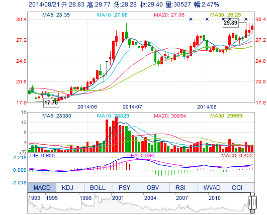 今開: 28.83 成交量: 3.05萬手 振幅: 5.19% 最高: 29.77 成交額: 8931.93萬元 換手率: 1.76% 最低: 28.28 總市值: 51.06億 市凈率: 14.76 昨收: 28.69 流通市...