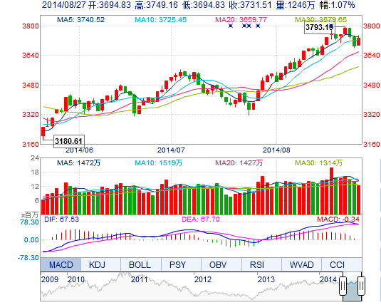 今開: 3694.83 最高: 3749.16 昨收: 3692.10 最低: 3694.83 成交量: 1246.43萬手 振幅: 1.47% 成交額: 243.39億元