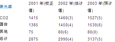 表1 全球工業(yè)激光系統(tǒng)產(chǎn)值(百萬(wàn)美元)(%增長(zhǎng)率)