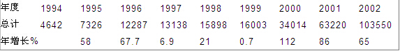 表2 1994-2002年中國(guó)國(guó)內(nèi)激光加工系統(tǒng)銷(xiāo)售額(萬(wàn)元人民幣)