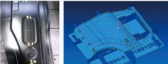 圖2 三維切割前刻線件手工標(biāo)示              圖3 插板式支架切割車門外板