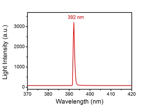 趙德剛研究員帶領(lǐng)的團(tuán)隊長期致力于GaN基光電子材料和器件研究,對材料生長機(jī)理、材料物理和器件物理有自己的理解和認(rèn)識,發(fā)現(xiàn)和解決了一系列激光器的關(guān)鍵問題:掌握了InGaN量子阱局域態(tài)調(diào)控和缺陷抑制方法,提高了發(fā)光效率;闡明了碳雜質(zhì)的補(bǔ)償機(jī)制,獲得了高質(zhì)量的p-GaN材料;設(shè)計出優(yōu)化的器件結(jié)構(gòu),減小了吸收損耗和電子泄漏;利用變程跳躍的物理機(jī)制,實(shí)現(xiàn)了良好的p-GaN歐姆接觸;解決了同質(zhì)外延中襯底翹曲的難題,采用MOCVD生長出高質(zhì)量的器件結(jié)構(gòu)。在此基礎(chǔ)上,與中科院蘇州納米所進(jìn)行工藝合作,最終實(shí)現(xiàn)了GaN紫外激光器的室溫電注入激射。條寬為10 μm、腔長為600 μm的激光器閾值電流密度為1.6-2.0 kA/cm2,激射波長為392-395 nm,連續(xù)激射輸出光功率可達(dá)80 mW。圖1為紫外激光器的激射光譜,圖2為P-I曲線,圖3為紫外激光器激射時照到復(fù)印紙上形成的藍(lán)色熒光光斑(紫外光人眼看不見,紫外激光照到復(fù)印紙上會發(fā)出藍(lán)色熒光)。