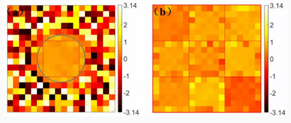 圖1(a)傳統(tǒng)的CAO算法校正后的相位殘差分布(b)PCAO算法校正后的相位殘差分布(μsL=3.35)
