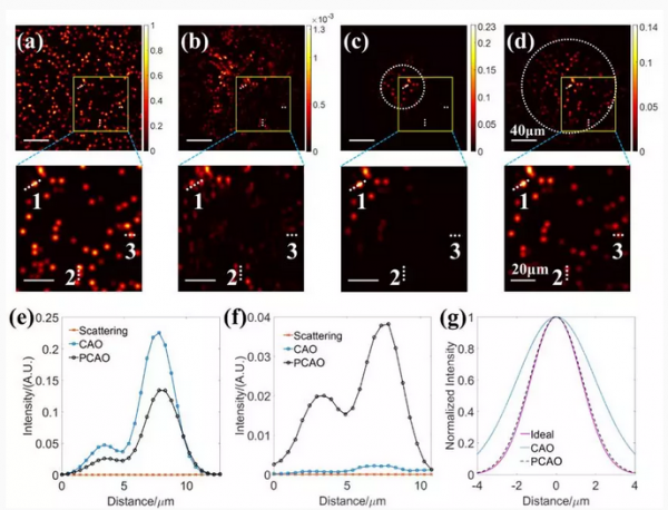 圖2 在200 μm×200 μm的視場內(nèi):(a)未放置散射介質(zhì)時;(b)透過隨機(jī)相位屏散射后;(c)傳統(tǒng)CAO算法校正后;(d)PCAO算法校正后,對4 μm熒光小球的成像結(jié)果。每個圖下側(cè)分別對應(yīng)放大后83 μm×83 μm視場內(nèi)的熒光圖像。白色虛線分別圈定校正視場的大致范圍。(e-g)分別對應(yīng)不同方法校正后沿白色虛線1,2,3處的光強(qiáng)分布曲線。其中(g)圖經(jīng)過光強(qiáng)歸一化并高斯擬合的處理。CAO表示傳統(tǒng)的單導(dǎo)引星的CAO算法。(散射介質(zhì)μsL=5.38)