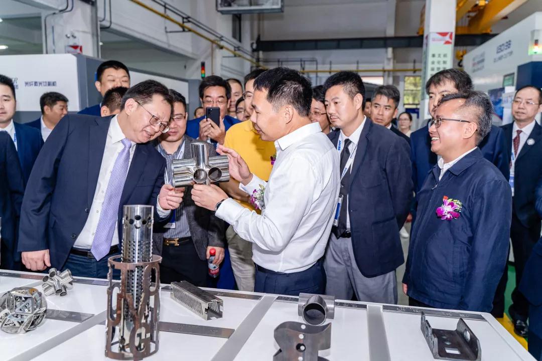 陳總帶領各位與會領導、嘉賓參觀新品,及湖南大族工廠激光切割機、切管機、折彎機等設備并作系統(tǒng)介紹。