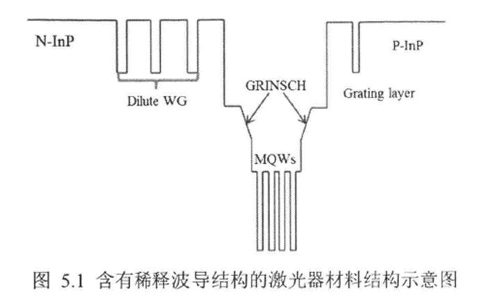 非對稱包層就是將n層和p層的折射率設(shè)置的不一樣,將光場分布偏移到n層,損耗較小,下圖的稀釋波導(dǎo)也起到非對稱包層的作用,可以看到光場分布有一定的變化,稀釋波導(dǎo)采用InP和InGaAs交替生長,一是散熱效果比較好,二是可以優(yōu)化折射率降低限制因子減小損耗。