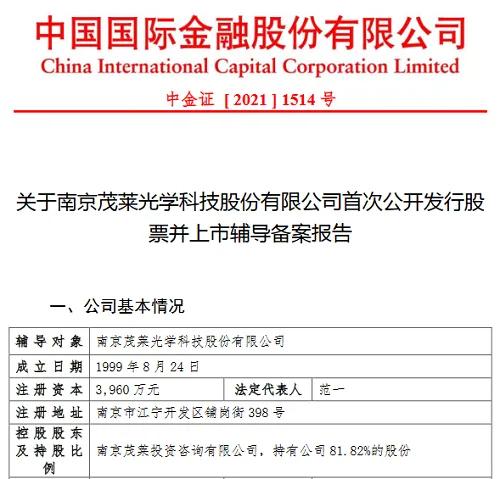 1月17日,中金公司發(fā)布關(guān)于南京茂萊光學(xué)科技股份有限公司首次公開發(fā)行股票并上市輔導(dǎo)備案報告。