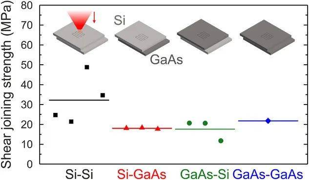 對(duì)比圖4中得到的剪切連接強(qiáng)度值,可以注意到這些值都在同一個(gè)數(shù)量級(jí),其中Si-Si表現(xiàn)出最強(qiáng)的粘結(jié)。不同的材料焊接配置,無論是Si或GaAs在頂部,得到的值相似,都小于Si - Si得到的值。盡管對(duì)GaAs-GaAs焊接情況進(jìn)行了一次測(cè)量,但結(jié)果表明Si-Si樣品的性能水平(測(cè)量分布的底部),因此與類似半導(dǎo)體焊接所獲得的優(yōu)異性能一致。與此同時(shí),有趣的是,與GaAs-Si相比,Si-GaAs結(jié)構(gòu)中測(cè)量的統(tǒng)計(jì)色散有所減少。這表明GaAs對(duì)實(shí)驗(yàn)波動(dòng)具有更好的魯棒性,這也可以歸因于GaAs的修飾閾值明顯低于Si。考慮到這一點(diǎn),我們假設(shè)Si - GaAs結(jié)構(gòu)必須容忍更多的光學(xué)接觸缺陷,即使在兩個(gè)分離良好的表面(R = 30%)的預(yù)期界面透射率約為50%,在Si和GaAs低樣品中,材料熔化也很容易同時(shí)達(dá)到。