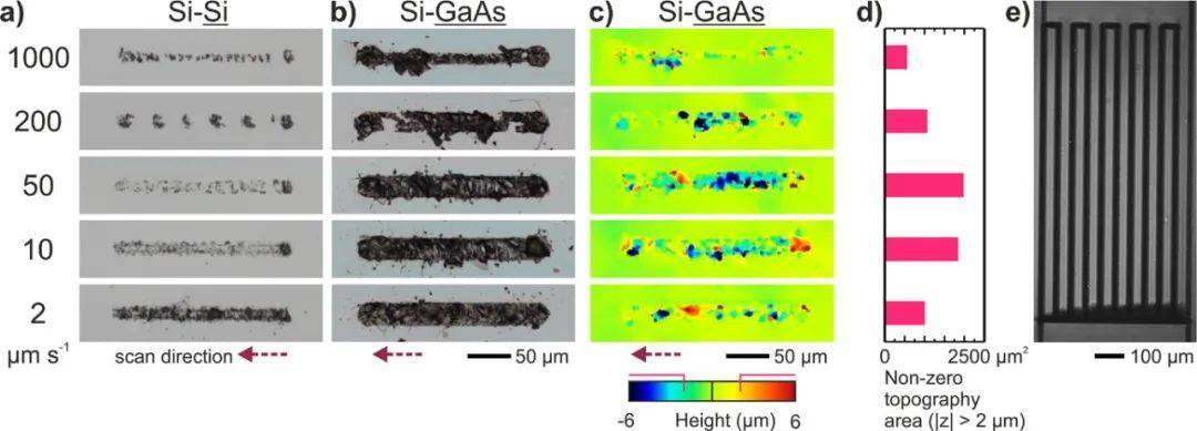 在圖3b中,展示了底部GaAs上產(chǎn)生的線的代表性圖像選擇。較低的修飾閾值使GaAs的相互作用更強(qiáng),從而產(chǎn)生更寬(≈30μm)和更明顯的線條。然而,與之前不同的是,對(duì)共焦圖像的分析(圖3c)揭示了最佳掃描速度,對(duì)應(yīng)于50 μm s-1,而不是最慢的掃描速度。為了說明這方面的詳細(xì)分析,我們?cè)趫D3d中為圖3c的每張圖像展示了地形中海拔或凹陷超過2 μm的區(qū)域(|z|>2 μm)。將這一任意判據(jù)作為材料混合概率的評(píng)價(jià)標(biāo)準(zhǔn),得出最佳掃描速度為50 μm s-1。與Si相比,這種增加的速度允許對(duì)幾個(gè)樣品進(jìn)行更快的光柵掃描輻照(如圖3e所示),從而在這種不同的半導(dǎo)體配置中測(cè)量到18±1 MPa的剪切連接強(qiáng)度。與Si-Si相比的差異可以合理地歸因于與表現(xiàn)出不同熱機(jī)械性能的材料焊接相關(guān)的通常挑戰(zhàn)。然而,它是適合的而且測(cè)量的強(qiáng)度有趣地顯示了這種技術(shù)的潛力,即使用貫穿Si傳輸配置將Si與其他半導(dǎo)體焊接。