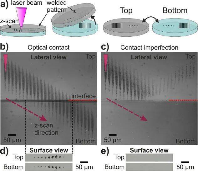 圖1:a)焊接結(jié)構(gòu)示意圖(z掃描和模式)和連續(xù)分離程序,以可視化激光照射時(shí)接觸的頂部和底部晶圓表面的變化。b,c)兩個(gè)Si晶片界面區(qū)域的紅外透射顯微鏡橫向視圖。紅色虛線表示接口的位置。在成像區(qū)中,從上到下不同深度(12.5 μm步長(zhǎng))(紫色虛線箭頭)產(chǎn)生1000個(gè)11 μJ脈沖的單點(diǎn)修改(25 μm橫向分離)。d,e)樣品分離后頂部和底部晶圓表面對(duì)應(yīng)的可見光顯微鏡圖像,如(a)所示。界面下經(jīng)過修飾的加工區(qū)域間接證明與底部晶圓具有良好的光學(xué)和高效耦合(b,d)。上樣內(nèi)部經(jīng)過修飾的加工區(qū)域,橫梁被界面反射,由于接觸不完美而沒有表面修飾(c,e)。
