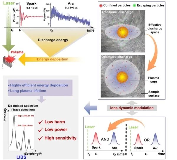 針對(duì)上述問(wèn)題,該團(tuán)隊(duì)提出離子動(dòng)力學(xué)調(diào)制方法,對(duì)克服傳統(tǒng)D-LIBS放電能耗大、安全風(fēng)險(xiǎn)高、環(huán)境危害大等不利因素,同時(shí)提高分析靈敏度具有顯著改善效果。該工作借助這一方法,合理優(yōu)化電極配置,有序調(diào)控放電模式,在有效增強(qiáng)光譜信號(hào)強(qiáng)度的同時(shí),大幅降低放電能耗。該工作的創(chuàng)新點(diǎn)在于:(1)首次提出并利用激光誘導(dǎo)等離子體沖擊波與外加電場(chǎng)空間零弧度耦合方式,實(shí)現(xiàn)有效放電區(qū)域全方位覆蓋激光等離子體中粒子的擴(kuò)散方向,離子的動(dòng)力學(xué)特征從原始的向外擴(kuò)散變更為放電空間內(nèi)陽(yáng)極和陰極之間的漂移運(yùn)動(dòng)。這種調(diào)制使得大部分離子被抓捕、約束在有效放電空間內(nèi),促進(jìn)電能與激光等離子體耦合,大幅降低放電能耗。(2)突破傳統(tǒng)D-LIBS方法,即僅在電容器放電過(guò)程中輔助LIBS,將放電增強(qiáng)LIBS拓展到電容器放電和充電的兩個(gè)過(guò)程。采用直流電源與充電電容共同作用等離子體間隙的策略,使約束的帶電粒子在電容放電結(jié)束后繼續(xù)在電極之間漂移,并在毫秒尺度維持帶電粒子電遷移運(yùn)動(dòng)特性,大幅延長(zhǎng)等離子體壽命,進(jìn)而實(shí)現(xiàn)火花和電弧放電的有序調(diào)控以及原子和離子光譜信號(hào)的選擇性增強(qiáng)。