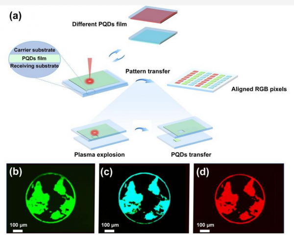 近日,吉林大學(xué)劉岳峰教授,夏虹教授和清華大學(xué)孫洪波教授在Nano Letters合作發(fā)表研究論文“High-Resolution Patterning of Perovskite Quantum Dots via Femtosecond Laser Induced Forward Transfer”。該論文通過飛秒激光誘導(dǎo)正向轉(zhuǎn)移(FsLIFT)技術(shù),成功實現(xiàn)了高分辨率全彩鈣鈦礦量子點陣列和任意微圖案。FsLIFT技術(shù)將轉(zhuǎn)移、沉積、圖案和對準集成在一個步驟中,并且不涉及掩模和化學(xué)試劑的使用,保證了鈣鈦礦量子點光物理特性不受影響。最終成功地實現(xiàn)了具有2μm線寬高分辨率的三基色鈣鈦礦量子點陣列。這項工作為促進基于圖案化鈣鈦礦量子點的各種實際應(yīng)用的開發(fā)提供了一種有前景的策略。通過FsLIFT技術(shù)制備基于鈣鈦礦量子點的全彩圖案和陣列過程如圖 1a 所示。我們使用飛秒激光實現(xiàn)了鈣鈦礦量子點基于非線性吸收的轉(zhuǎn)移。飛秒激光聚焦在鈣鈦礦量子點薄膜和載體襯底之間的界面上,鈣鈦礦量子點通過非線性吸收引起等離子體的產(chǎn)生和膨脹。因此,激光輻照區(qū)域中的鈣鈦礦量子點可以轉(zhuǎn)移到接收襯底上。由于超短脈沖短于電子-聲子耦合時間,在激光和鈣鈦礦量子點相互作用的過程中,晶格仍然是“冷”的,因此沒有發(fā)生熱損傷,可以很好地保持鈣鈦礦量子點的光物理性質(zhì)。圖1b-d展示了基于紅、綠和藍鈣鈦礦量子點的地球圖案的熒光照片。所得到的實驗結(jié)果說明FsLIFT技術(shù)具有制備圖案化鈣鈦礦量子點的能力。