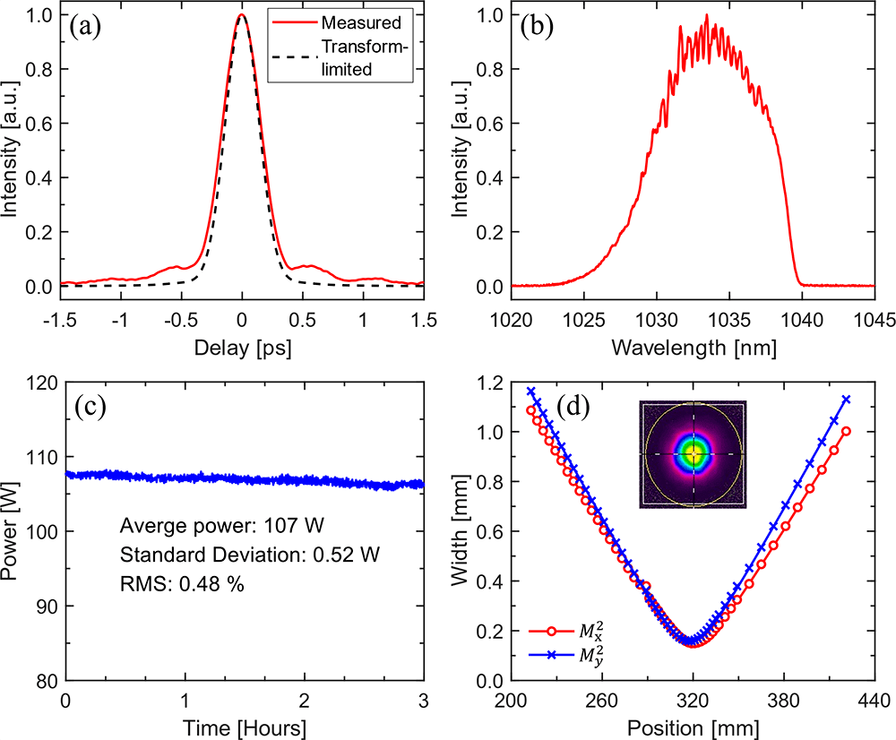 圖2. 單脈沖1.07 mJ時(shí)的(a)自相關(guān)曲線,(b)光譜分布,(c)功率穩(wěn)定性和(d)光束質(zhì)量結(jié)果