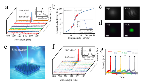 a、亞波長(zhǎng)垂直腔激光輸出光譜;b、激光輸入輸出圖;c、激光干涉圖;d、激光輸出光斑圖;e、水下激光示意圖;f、水下激光輸出光譜;g、20天水下激光穩(wěn)定輸出