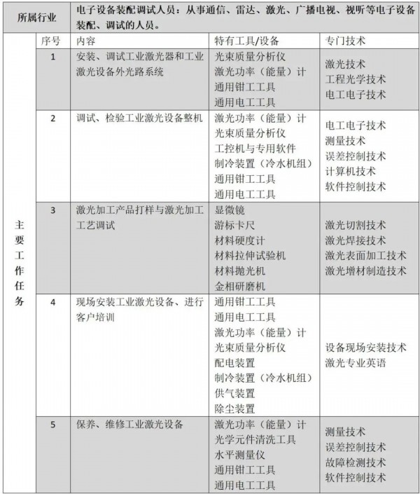《激光設(shè)備安裝調(diào)試員》新職業(yè)列出的主要工作任務(wù)