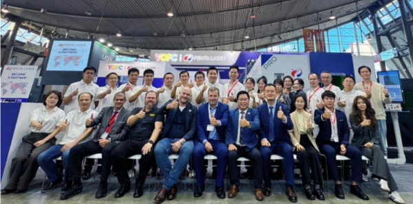△ 奔騰激光與歐洲市場(chǎng)的代理商團(tuán)隊(duì)在博覽會(huì)展臺(tái)合影