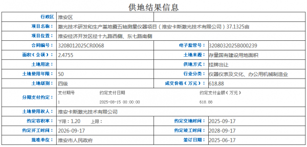 在激光產業(yè)高端化進程中,核心部件與精密測量技術的突破成為關鍵。2025年6月,淮安卡斯激光技術有限公司以618.88萬元競得淮安經濟開發(fā)區(qū)37.13畝土地,啟動激光技術研發(fā)和生產基地暨五軸測量儀器項目,將于2026年開工、2028年竣工,專注激光核心技術攻堅。