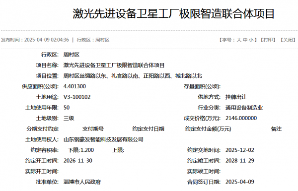 2025年4月,山東鋼豪發(fā)智能科技發(fā)展有限公司以2146萬元拿下淄博周村區(qū)4.4013公頃土地,投資2.8億元建設激光先進設備衛(wèi)星廠極限智造聯(lián)合體項目,計劃2026年開工、2028年竣工,聚焦光纖激光切割機量產。