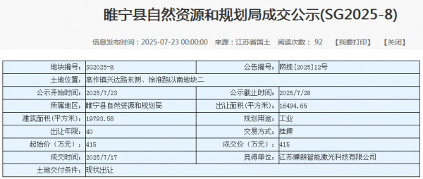 在激光產業(yè)向區(qū)域縱深滲透的過程中,縣域經濟成為重要承接載體。2025年7月17日,江蘇博朗智能激光科技有限公司以415萬元底價競得睢寧縣高作鎮(zhèn)SG2025-8號工業(yè)用地,地塊面積1.649465公頃。該地塊約定2025年12月1日開工、一年竣工,從拿地到投產周期僅18個月,凸顯中小企業(yè)“快布局、快落地”的發(fā)展特點。