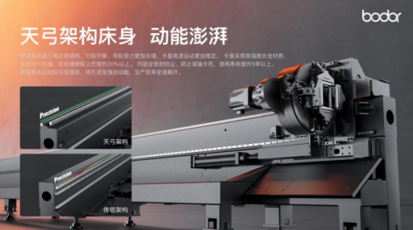 首先,創(chuàng)新的天弓架構(gòu)床身采用三角立體傳動系統(tǒng),從力學(xué)上優(yōu)化高速運動中導(dǎo)軌受力,達到力矩平衡,為所有精密動作提供持久而可靠的基礎(chǔ),真正像天弓滿弦,持久迸發(fā)強勁動能,生產(chǎn)效率全速飆升。