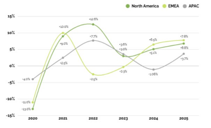 報(bào)告顯示,在經(jīng)歷了前幾年的波動(dòng)后,增材制造行業(yè)的薪酬增長(zhǎng)已回歸更加穩(wěn)定、長(zhǎng)期的增長(zhǎng)模式。2025年,北美地區(qū)以 7.8% 的薪酬漲幅領(lǐng)跑全球,其次是 EMEA(歐洲、中東和非洲)地區(qū)的 6.8%;亞太地區(qū)在經(jīng)歷上一年的下滑后重回增長(zhǎng)區(qū)間,增幅為 3.7%。