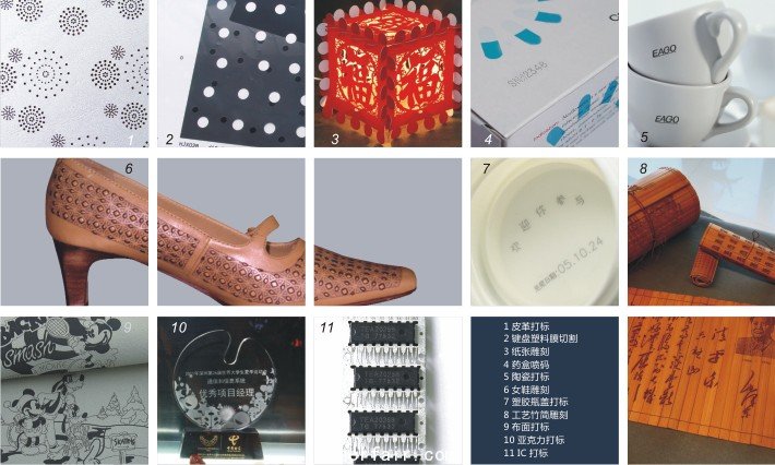 • 可雕刻非金屬和部分金屬材料。廣泛應(yīng)用于食品包裝、飲料包裝、醫(yī)藥包裝、建筑陶瓷、服裝輔料、皮革、鈕扣、織物切割、工藝禮品、橡膠制品、電子元件、外殼銘牌。