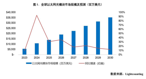 根據(jù) LightCounting 預(yù)測,全球以太網(wǎng)光模塊市場將在 2024 至 2029 年間保持約 22% 的年復(fù)合增長率,預(yù)計(jì)到 2030 年市場規(guī)模將突破 350 億美元。AI 基礎(chǔ)設(shè)施建設(shè)成為推動增長的關(guān)鍵動力——僅 2025 年第二季度,微軟、亞馬遜、meta 和谷歌四大云廠商的資本支出同比增長近 70%,顯著拉動了 800 G 及更高速率光模塊的需求。美國作為全球最大光模塊需求市場,占據(jù)約六成份額,其 AI 數(shù)據(jù)中心的持續(xù)投資進(jìn)一步加速了高端光模塊的應(yīng)用擴(kuò)展。