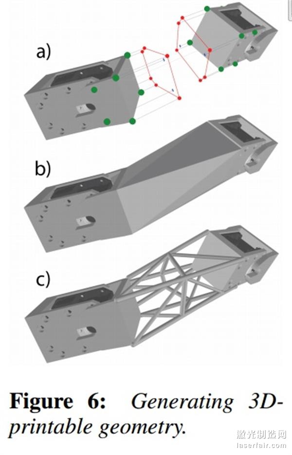 一旦迭代設(shè)計(jì)完成,該工具隨后會(huì)生成機(jī)器人的完整身體,包括可3D打印的電子元件的連接件等。“我們的系統(tǒng)會(huì)從帶伺服電機(jī)的CAD模型開始,就像插圖(見(jiàn)下文)那樣進(jìn)行可視化。在預(yù)處理步驟中我們會(huì)生成兩種比較緊湊的3D模型,可以直接用螺釘或者螺釘或鉚釘將伺服電機(jī)裝在上面,并使之成為我們系統(tǒng)所產(chǎn)生的幾何形狀的一部分。”他們解釋說(shuō)。在3D打印之前,用戶也可以修改模型以滿足他們的特殊(或者審美)需求。